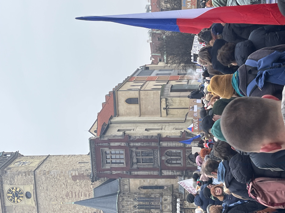 A dense crowd of individuals occupies the foreground and midground of the image, facing towards a collection of historical buildings under an overcast sky. The scene is located in Old Town Square (Staroměstské náměstí) in Prague, Czechia. On the far left, a portion of the Old Town Hall's stone clock tower, featuring two distinct clocks, is visible. Adjacent to it on the right is the gothic House at the Minute, characterized by its dark red, intricately decorated facade with multi-paned windows. Further to the right are lighter-colored buildings with arched windows and red tiled roofs. The people in the crowd are predominantly adults, dressed in various winter garments including hats, coats, and scarves. Their backs and heads are mostly visible. On the far right, a large Czech national flag, displaying horizontal red and white stripes with a blue wedge extending from the hoist, is held vertically. Within the crowd, several signs and banners are present; one sign, partially obscured, clearly displays the Czech word "NOVÉ" (NEW). Another banner to the far right shows fragmented text including "NA P." and "20". A blue flag is also visible within the crowd further back. A plume of white smoke or vapor emanates from a point within the midground of the crowd. No specific individual actions or interactions are discernible due to the crowd's density and the perspective.
