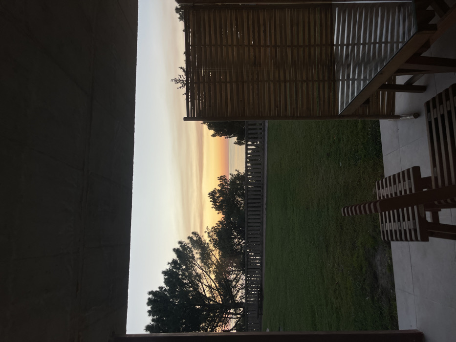 The image displays an outdoor area at dusk, viewed from under a dark concrete overhang