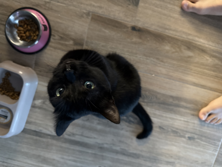 An overhead image depicts an indoor scene on a light-colored wood-grain floor. The specific location within Gabrovo, Bulgaria, cannot be determined from the visual information. A black domestic cat is centrally positioned, sitting with its body facing forward and its head tilted upwards, looking directly into the camera. The cat has short, dark fur, visible whiskers, and prominent green eyes. To the upper right of the cat, a white, two-compartment plastic pet feeder is present; its right section contains dry kibble, and its left section holds a small, partially obscured metallic can. Further to the right, a pink-rimmed stainless steel pet bowl is also visible, containing dry kibble. In the lower left foreground, a bare human left foot is partially visible, indicating the presence of an individual standing over the cat.