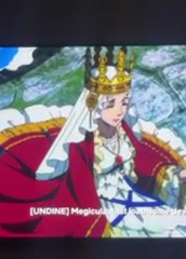 n anime on a television screen. The anime depicts a white-haired queen in elaborate royal garb, including a crown, a red and gold robe, and a white dress. She is holding a golden staff. Subtitles at the bottom of the screen read, "UNDINE: Megicula, that loathsome devil who cursed my dear Loropechika..." The background of the scene appears to be a light green and white patterned area, possibly indicating an icy or magical setting. The television is positioned against a dark wall.