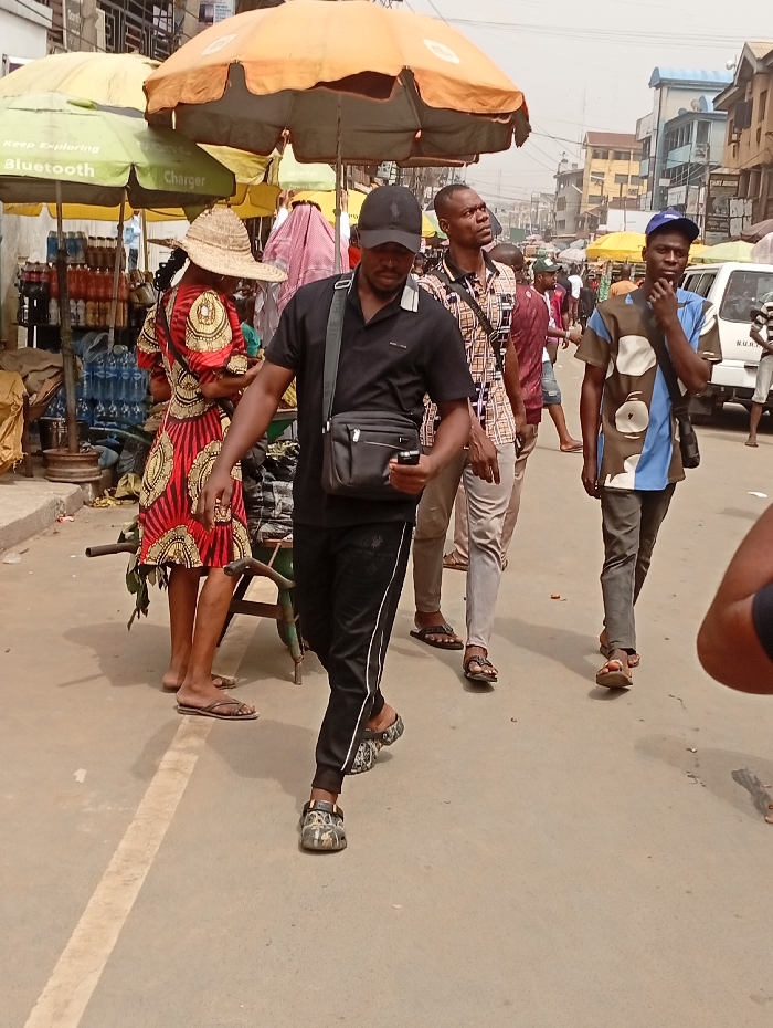 A crowded street scene shows several people walking in different directions. A man in a black polo, track pants, and cap is in the foreground, looking down at his phone. Another man in a patterned shirt follows behind. To the left, a woman in a straw hat and colorful dress stands near a drink stall shaded by green umbrellas. A van is visible in the background, adding to the urban hustle.
