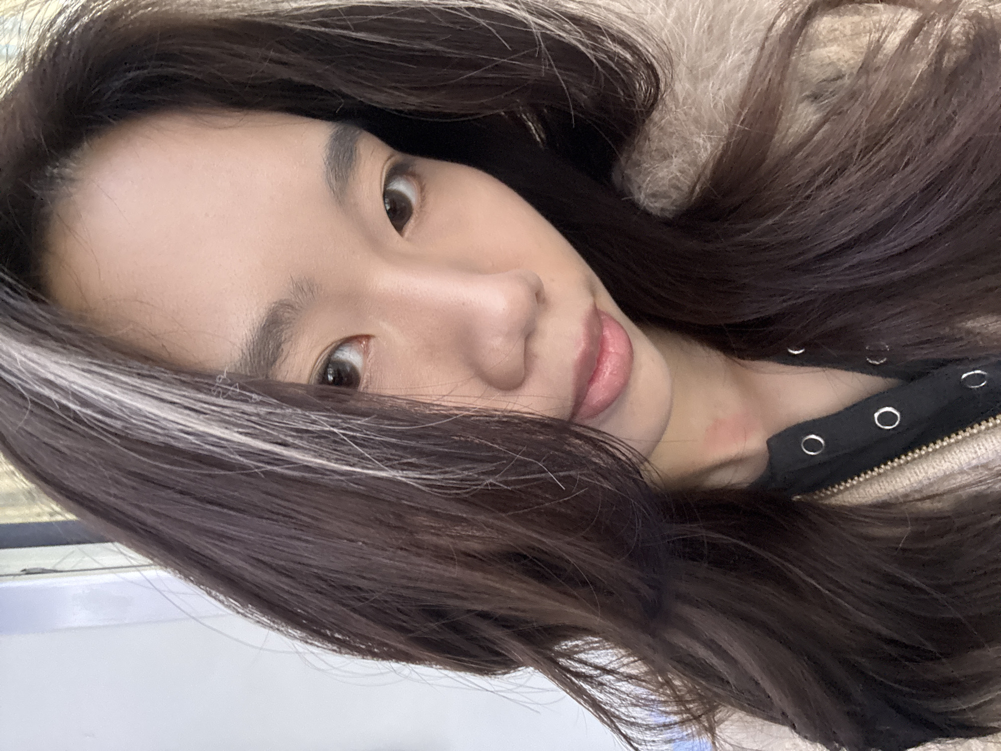The image presents a close-up, indoor portrait of a young adult East Asian female