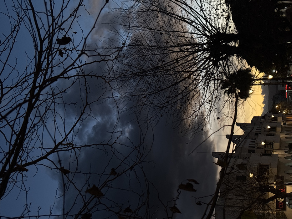 Bare tree branches fill the foreground against a dramatic sky with dark, ominous clouds