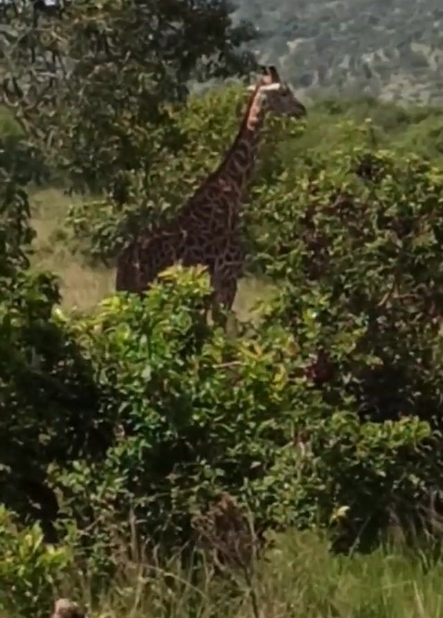 giraffe standing in a grassy area with bushes and trees. The giraffe has a brown and tan patterned coat and a long neck. In the background, there is a hill covered in trees. The sky is blue.