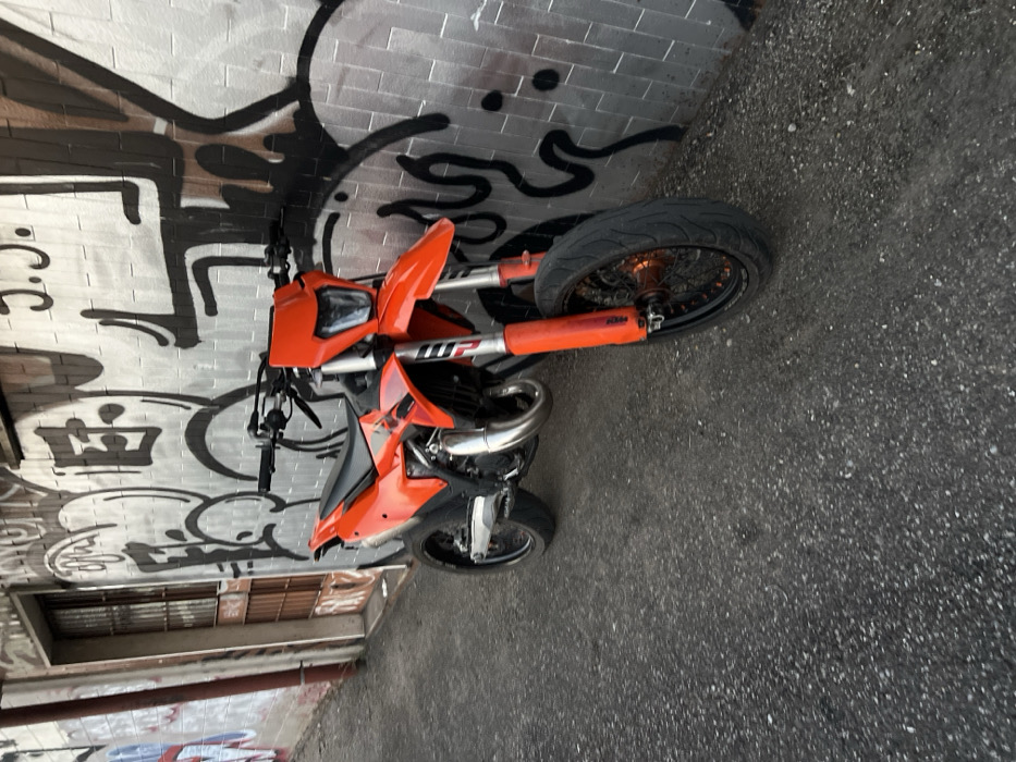 - "A bright orange supermoto-style motorcycle is positioned on a dark gray asphalt surface in what appears to be an urban alleyway" by FM-lVzCJ3, licensed under CC BY 4.0