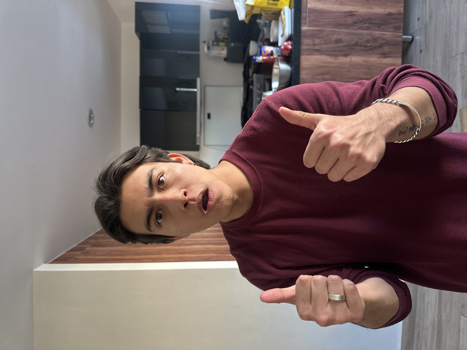A fair-skinned man with dark hair, wearing a maroon long-sleeved shirt, gives a thumbs-up with both hands. He wears a silver ring on his left hand and a silver bracelet on his right wrist, with visible writing or tattoos. The background includes a kitchen area with dark cabinets, a white refrigerator, and various kitchen items on the counter. The walls are a mix of white and wood paneling, with a gray floor. The image is taken at a slightly angled perspective.