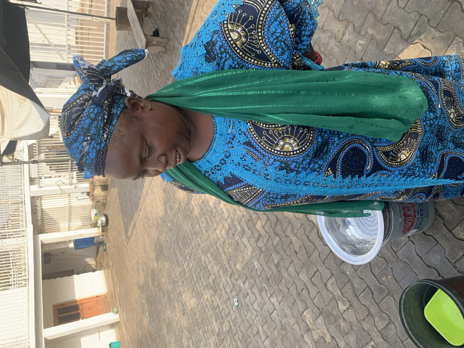 An adult woman stands in an outdoor paved courtyard in Okene, Nigeria, facing slightly right and looking downwards