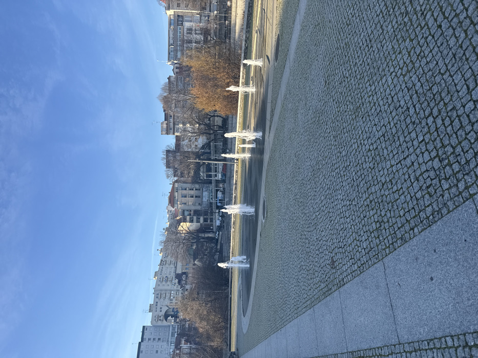 The image displays an urban park area within the Jardim da Avenida Cidade de Zamora in Bragança, Portugal, under clear, sunny daylight. The foreground is paved with grey granite cobblestones, transitioning to a smooth grey granite slab border on the left. In the midground, a modern, dark-bottomed water feature, irregularly shaped and integrated into the cobblestone paving, contains nine active water jets emitting vertical columns of white water of varying heights. No individuals are present in the immediate vicinity of the fountain or foreground. The background reveals a city skyline composed of numerous multi-story buildings, predominantly residential or mixed-use, ranging from four to eight stories high, with light-colored facades and visible windows. A line of bare deciduous trees with dark branches partially obscures the middle distance, while other trees with brown-orange foliage are visible further right. A section of a road or riverbank with parked vehicles is discernible beneath the tree line. The sky is bright, clear blue with minimal, wispy white clouds. The low angle of the sun creates distinct shadows from the fountain jets, suggesting morning or late afternoon.
