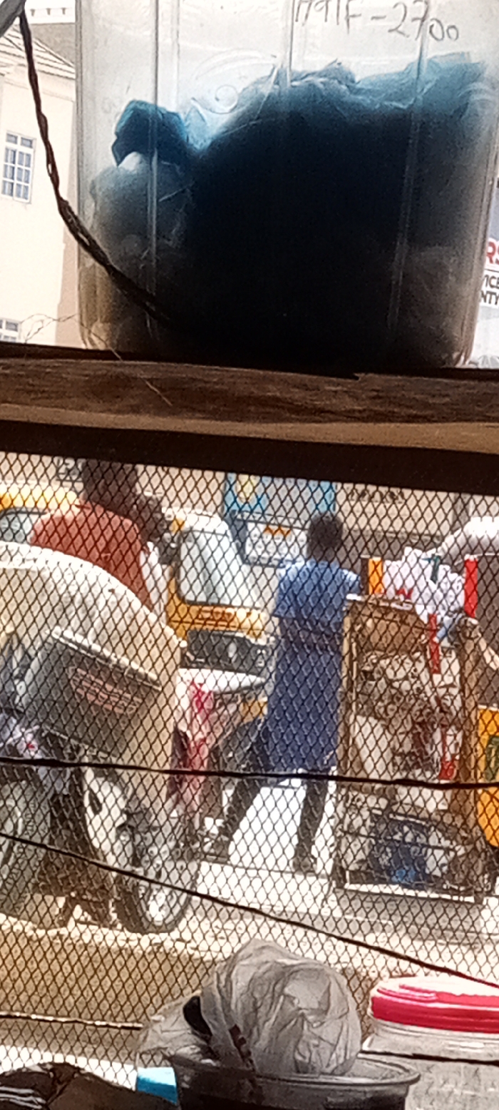 The image depicts an outdoor scene in Sabon Gari West, Nigeria, observed from a slightly elevated vantage point through a diamond-patterned metal mesh. In the immediate foreground, at the top, a clear plastic container holds dark blue material; "1791F - 2700" is handwritten on its side. A dark brown wire extends across the upper left. Below this, a horizontal brown wooden beam separates the upper foreground from the main street scene, which is viewed through the metal mesh. In the bottom foreground, a crumpled grey plastic bag rests on a dark container, adjacent to a clear container with a red lid. Beyond the mesh, a street or market scene unfolds under daylight conditions. Two individuals are visible. On the left, a person wearing a reddish-brown shirt is partially obscured by a white object, facing away from the viewer. To the right, another person, dressed in a blue tunic, stands facing away, interacting with a dark mobile cart or stall loaded with various items, including some with red and white packaging. Vehicles include a white motorcycle or scooter, partially visible behind the person in the reddish-brown shirt, and a yellow Keke Napep (auto-rickshaw) situated in the central background. The ground appears to be a light-colored, unpaved surface. Further background elements are blurred.