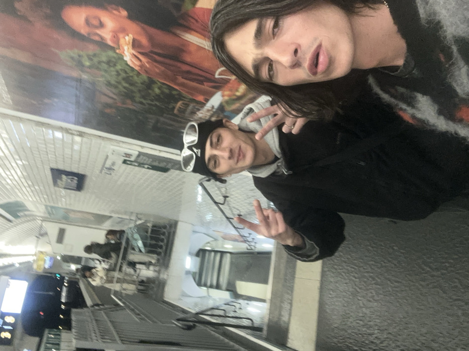 Two young adult males are captured in a selfie taken within the Villiers metro station in Paris, France