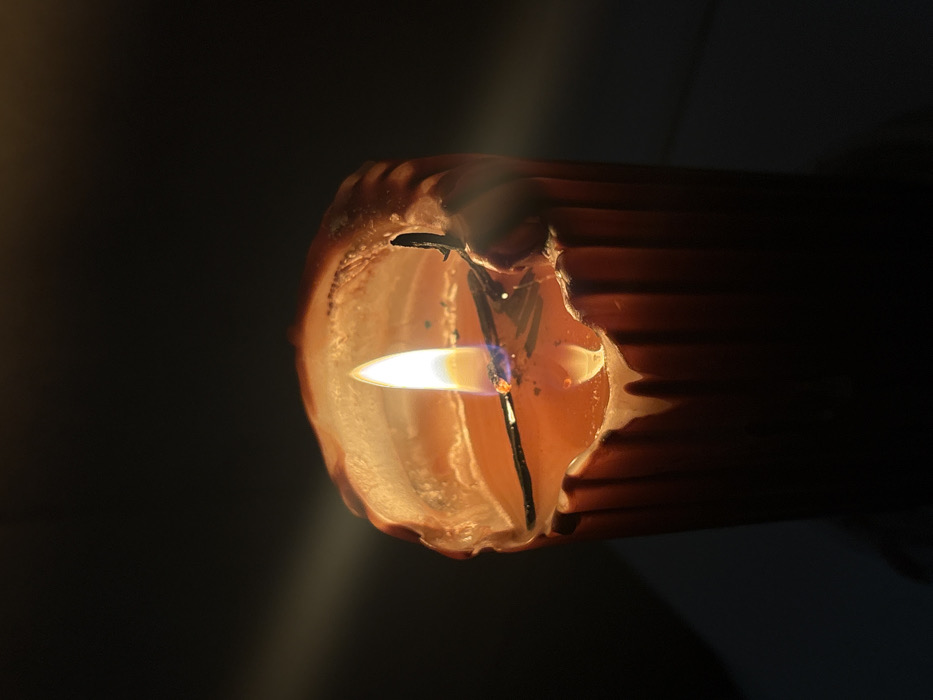 - "This image, captured in Перовское сельское поселение, Ukraine, displays a single, actively burning pillar candle in a darkened setting" by FM-hdgEB3, licensed under CC BY 4.0