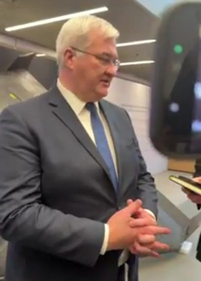 A man in a blue suit and tie is standing and talking to someone holding a phone. The man has white hair and glasses. He is holding his hands together in front of him. Behind him is a display with a grey model of some sort of aircraft or drone. The display also has some text on it. The background is a modern looking space with light colored walls and a light colored ceiling.