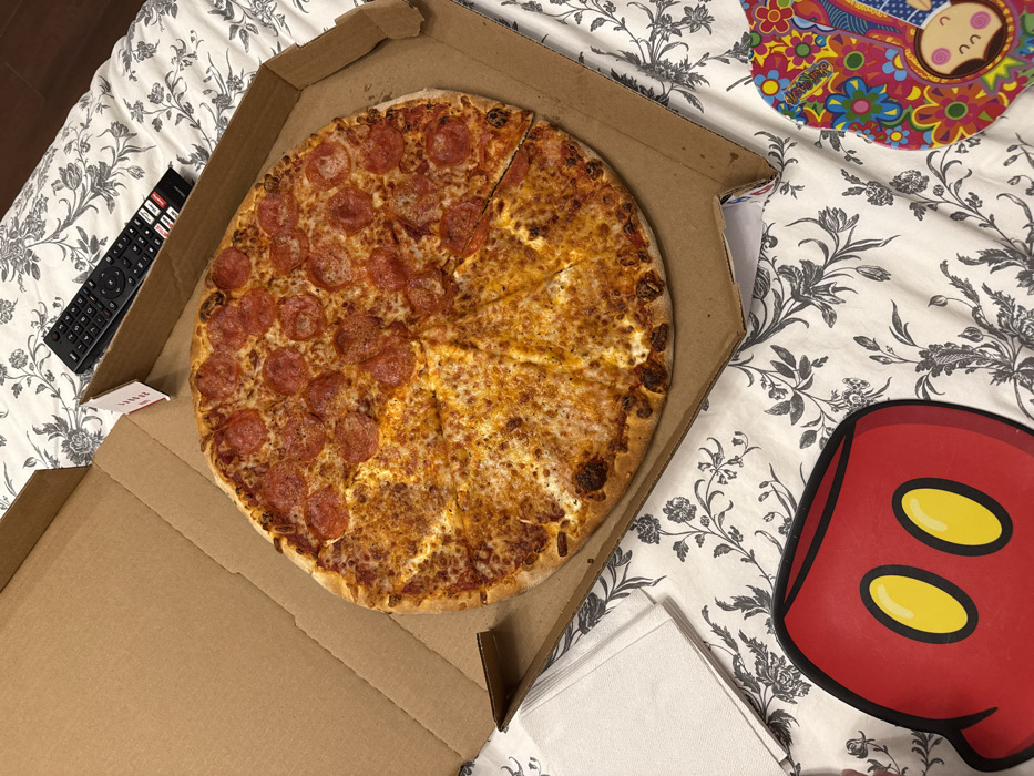 - "The scene depicts a large, circular pizza resting inside an open cardboard pizza box, placed on a white bedsheet adorned with a gray floral pattern" by FM-avfjN2, licensed under CC BY 4.0