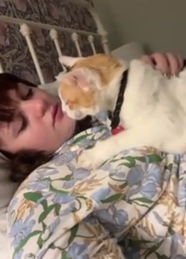A woman with reddish-brown hair lies on her back in bed, wearing a blue and green floral patterned shirt. An orange and white cat with a black collar and red tag stands on her chest, nuzzling her face. The bed has a white metal frame and the wall behind the bed is covered in a dark floral wallpaper. The woman's eyes are closed, and she appears relaxed while the cat interacts with her.