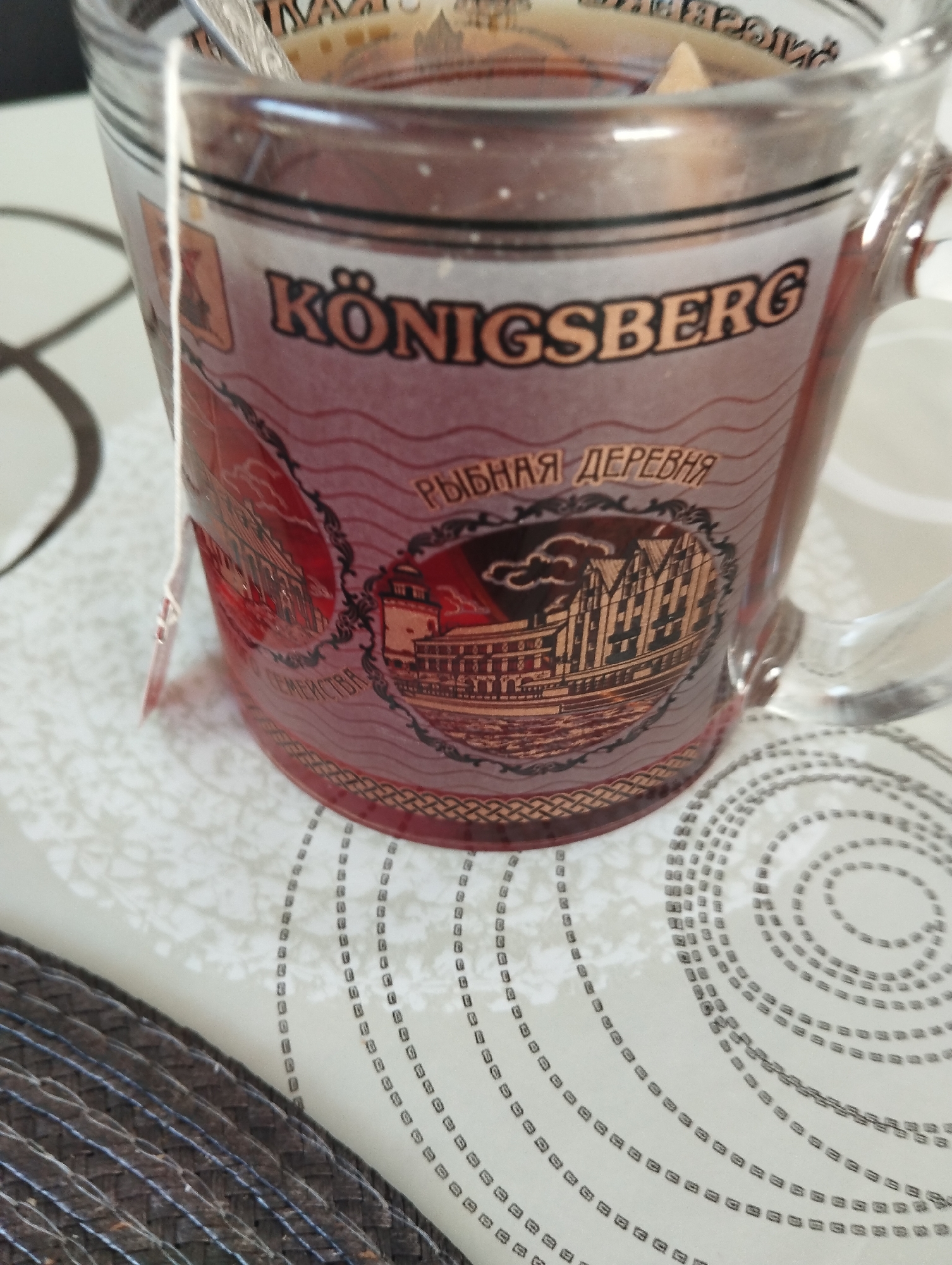 Here is a detailed description of the image: **Subject:** A glass mug filled with tea. **Objects:** * **Mug:** The mug is clear glass with a decorative design. The design features the word "Königsberg" in a stylized font, along with a depiction of a "РЫБНАЯ ДЕРЕВНЯ" (Fishing Village) scene in a frame. There is a handle on the right side. * **Tea:** The mug is filled with a dark liquid, presumably tea. A teabag string and tag hang over the side. * **Surface:** The mug rests on a light-colored surface decorated with concentric circles composed of small squares. A portion of a dark, woven placemat is visible in the lower-left corner. **Environment:** The setting appears to be indoors, likely on a table or countertop. The lighting suggests it is daytime. **Details:** The design on the mug refers to Königsberg, the former German name for the present-day city of Kaliningrad, Russia. The text "РЫБНАЯ ДЕРЕВНЯ" (Fishing Village) is in Russian. This indicates the mug is probably a souvenir from that region. The cup is filled with tea, and a teabag is being used.