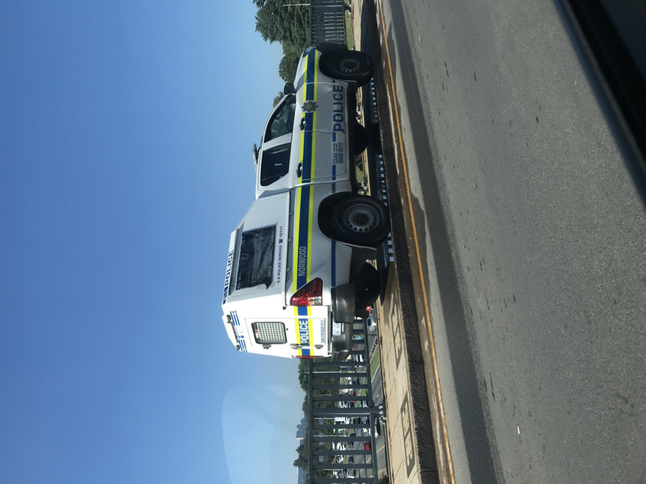 A white police vehicle with blue and yellow stripes, labeled "Police" and "Norwood", is parked on the side of a road. The vehicle's tires are visible. A fence and trees are in the background, along with a hazy cityscape. The sky is clear blue. The image is taken from an elevated position, possibly from within another vehicle.