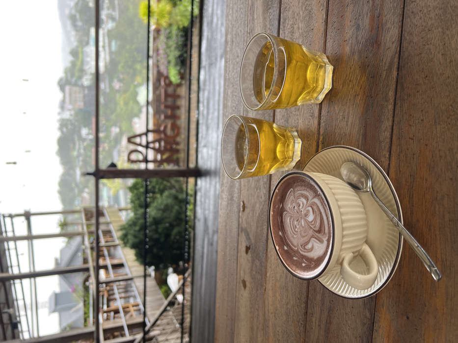 On a wooden table, two glasses of yellow liquid sit near a cappuccino with latte art on a saucer with a spoon. Beyond a metal railing and structure, a blurred cityscape peeks through the overcast sky. The weather appears damp.
