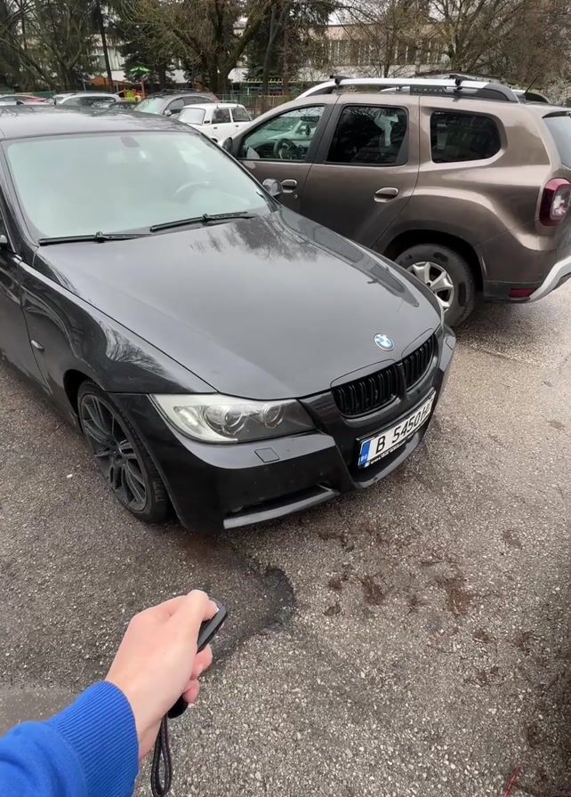 man pressing a car key, and then a quick scan of the parking lot showing a variety of cars. The first car shown is a black BMW, followed by a blue Lancia with copper-colored accents. The camera pans across an asphalt parking lot, filled with a dense row of cars, including a silver Volkswagen, and a mix of sedans and hatchbacks in various colors. The setting appears to be an urban residential area, with buildings visible in the background, suggesting a typical city parking arrangement. The weather seems overcast.
