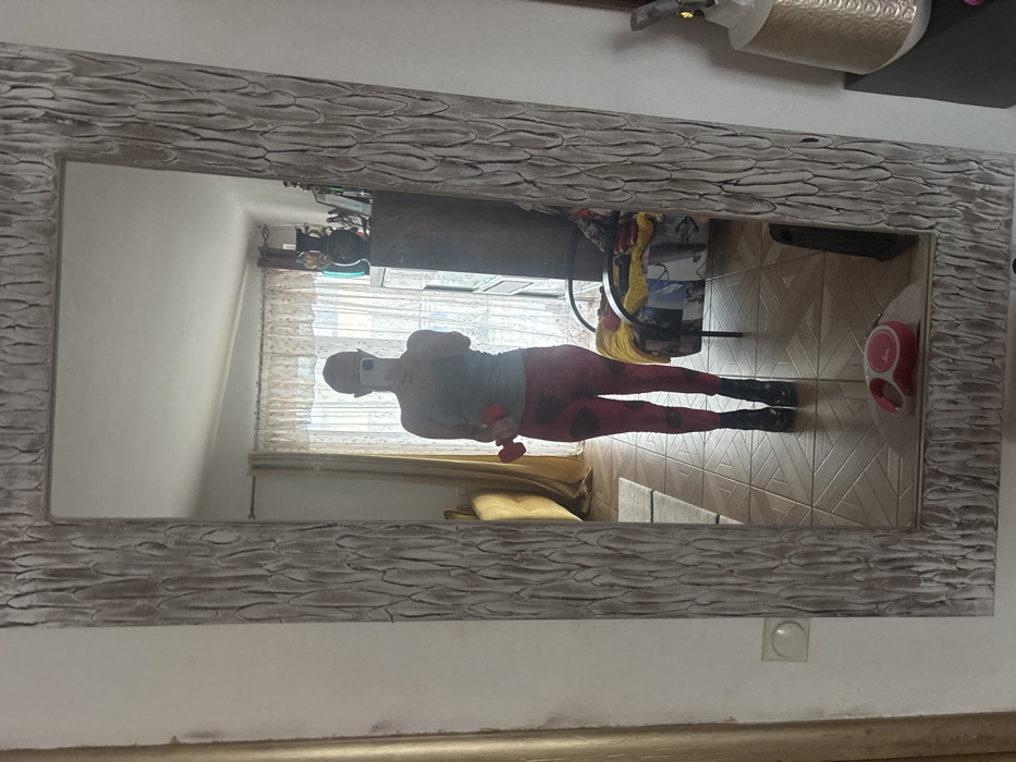 A mirror framed with a textured, light-colored material reflects a room. A person in the mirror is wearing dark boots, red leggings with black spots, and a grey shirt while holding a small red object. The room contains patterned floor tiles, curtains, a window, and furniture including what seems to be a chair, desk, and pillow. A white object rests on a shelf above the mirror.
