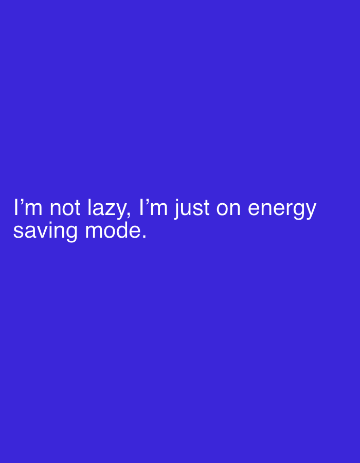 The image displays white text on a solid dark blue background. The text, rendered in a sans-serif typeface, states: "I'm not lazy, I'm just on energy saving mode." This phrase is centrally aligned and positioned in the lower-middle section of the frame. No discernible physical location, specific environment within Byala, Bulgaria, or any individuals, objects beyond the text, actions, or interactions are visually present in the scene. The entire visual content consists solely of this textual overlay on a monochromatic field.