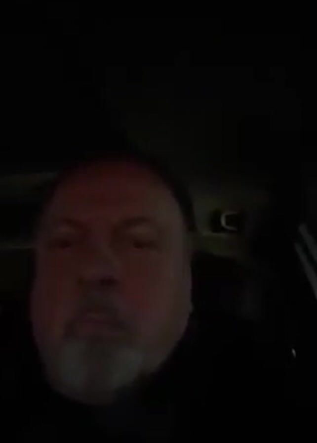man in a car at night. The man is white, with graying hair and a goatee. He is wearing a black shirt. The lighting is dim, and only his face is well-illuminated. He looks directly at the camera with a serious expression. Music is playing in the background. The car's interior is visible but dark.