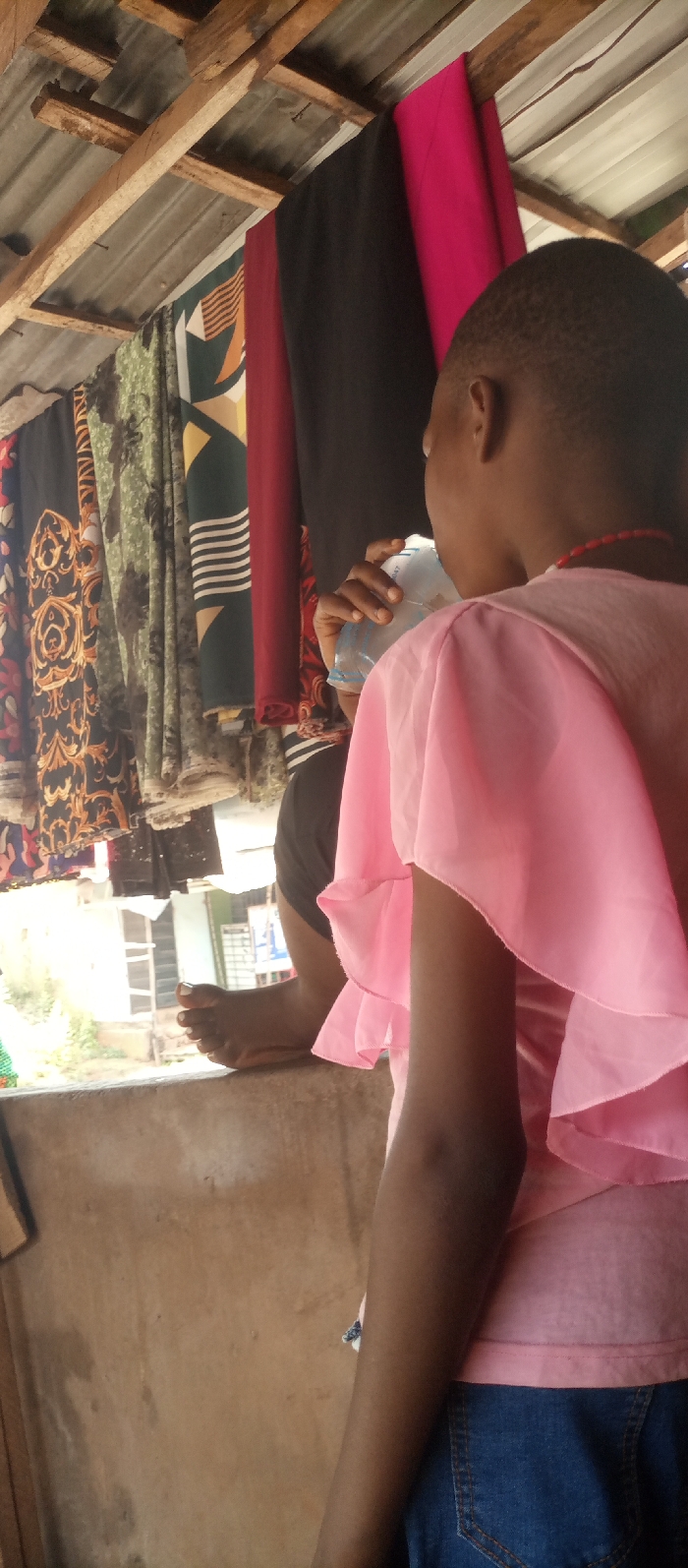 The scene depicts an interior view of what appears to be an open-fronted commercial establishment, likely a fabric stall, in Umuoji, Nigeria. The perspective is from slightly behind and to the right of a primary individual. In the foreground, a person with short dark hair is observed from the back and right side. This individual wears a light pink, short-sleeved top with layered ruffle detailing on the sleeves and blue denim bottoms. A red beaded necklace is visible around their neck. To the left and slightly behind the primary individual, a second person is partially visible. This individual holds a clear plastic sachet or container to their mouth, appearing to drink from it. Their bare left foot, with white-painted toenails, rests on a concrete ledge that extends across the lower mid-section of the image, separating the interior space from the exterior. This person wears dark-colored shorts. Above, the ceiling consists of corrugated metal sheets supported by exposed wooden rafters. From these rafters, multiple rolls of fabric or draped clothing items are suspended. These fabrics exhibit various patterns and colors, including black with gold motifs, green with dark botanical designs, striped patterns, plain dark red, and plain black, suggesting merchandise for sale. Beyond the concrete ledge, an exterior environment is visible, characterized by soft natural light. Distant structures, including a building with a window frame and hints of vegetation, are present. The wall to the right of the foreground individual is a light brown, possibly unpainted concrete or mud wall, showing some discoloration.