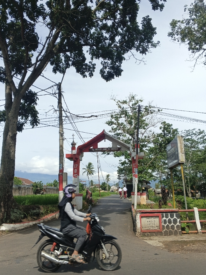 A woman on a motorcycle drives along a road leading to an ornate archway. The archway is painted red and white and is inscribed with the words "MESJID JAMIK AL HIKMAH." The road is lined with green fields and trees. The sky is partly cloudy, and there is a mountain range in the distance. A telephone pole stands to the left of the archway, with many wires running across it.
