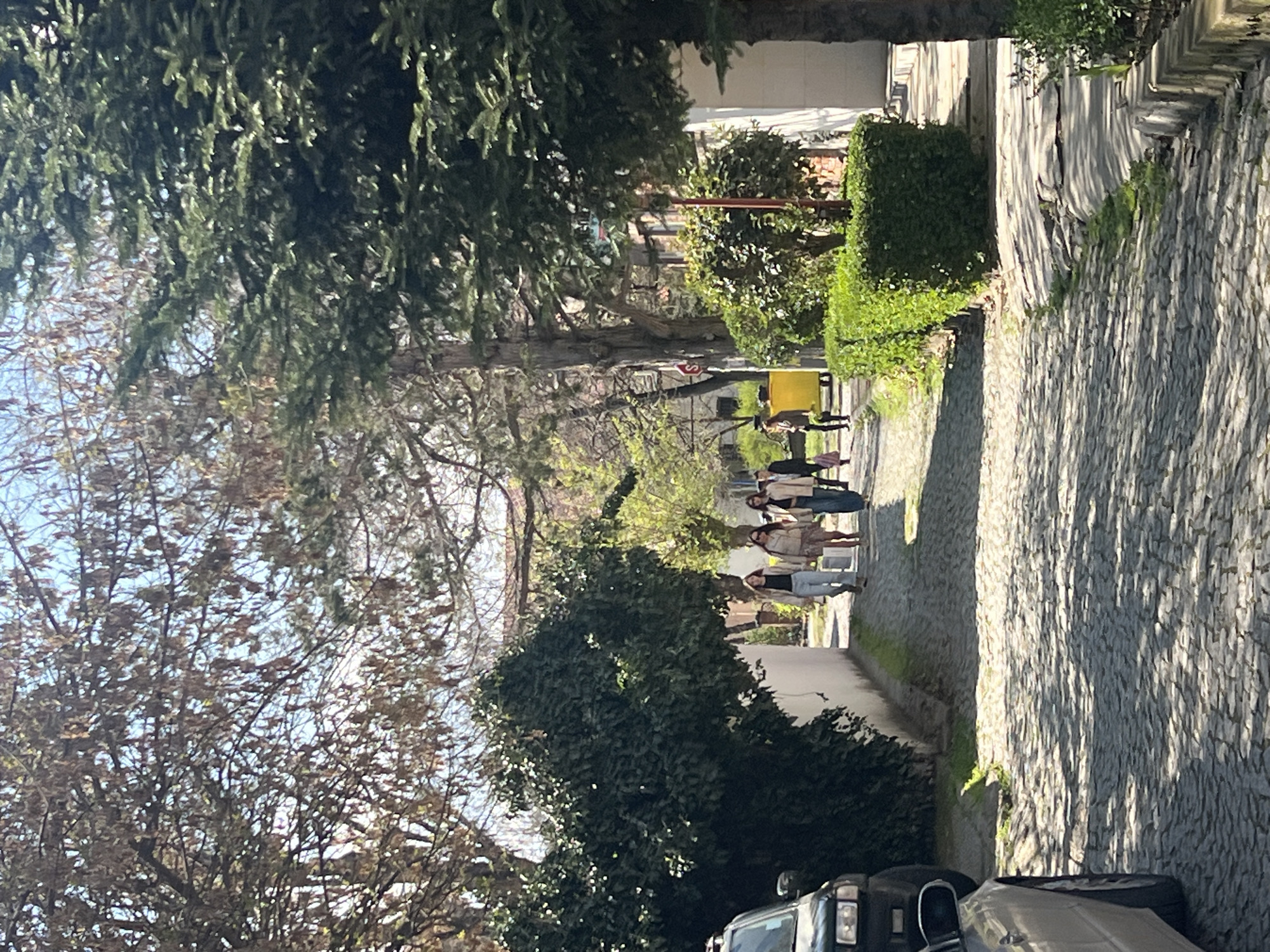 The image depicts a street scene in Pazardzhik, Bulgaria. A group of six individuals are walking along a sidewalk lined with trees and vegetation. The sidewalk is constructed of cobblestones. A row of buildings is visible along the opposite side of the sidewalk. The lower portion of a parked car can be seen on the right side of the image. The street is partially shaded by trees.