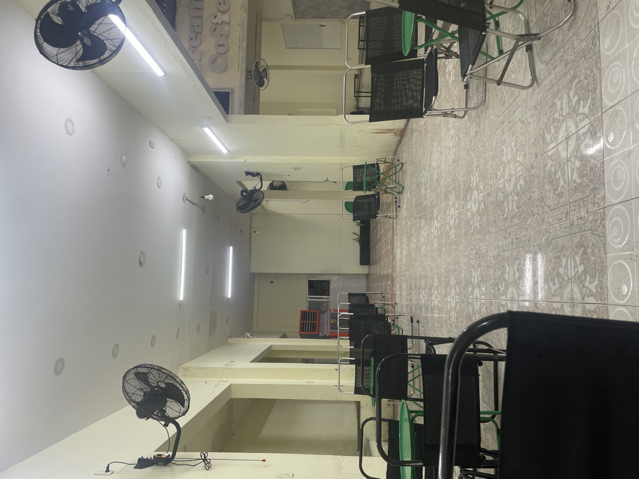 This image displays the interior of a vacant coffee shop, likely situated in Nha Trang, Vietnam
