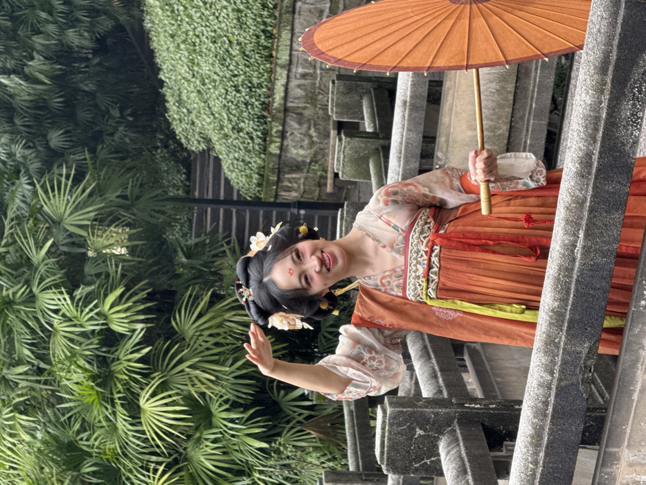 A young East Asian female is positioned outdoors, partially obscured by a weathered gray stone railing in the foreground. She is dressed in traditional Hanfu-style attire, consisting of a patterned, light-colored long-sleeved top with a V-neck, and a pleated orange-brown skirt secured by a decorative waist sash. A reddish-orange shawl-like garment drapes over her left shoulder. Her dark hair is styled in an elaborate updo, adorned with white floral ornaments and gold-colored hairpins. She wears yellow, string-like earrings and has a red decorative mark on her forehead, alongside visible blush and red lipstick. She smiles broadly, looking towards the viewer. Her right arm is raised, with her palm facing away and fingers slightly spread. In her left hand, she holds an orange traditional Chinese oil-paper umbrella, which is closed, with a red decorative knot hanging from its handle. The background features dense, lush green vegetation, including large palm-like leaves on the left. To the right, stone steps ascend an incline, bordered by a low stone retaining wall covered in green ivy or ground cover. The scene depicts an outdoor public park or elevated pedestrian area within Yuzhong District, Chongqing, China, characterized by stone pathways, balustrades, and abundant subtropical foliage.