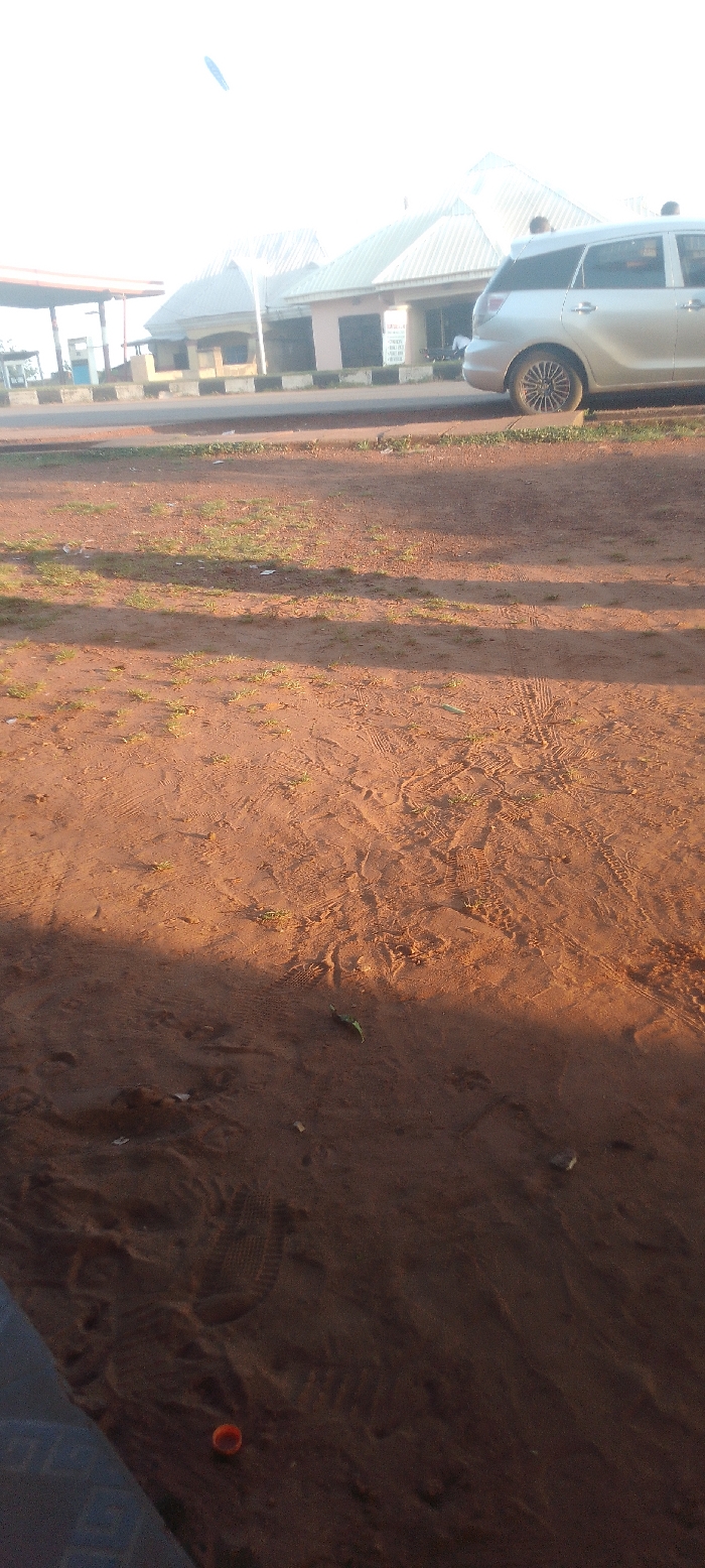The scene is an outdoor ground-level view in the city of Unknown, Unknown, depicted under bright daylight conditions. The immediate foreground is comprised of reddish-brown dirt with scattered patches of sparse green vegetation, marked by numerous footprints and tire tread impressions. An orange plastic bottle cap rests on the dirt near the bottom left, and a dark shadow extends diagonally from the lower left to the center of the frame. In the midground, a paved road with a low concrete curb, painted black and white in segments, runs horizontally across the image. A silver SUV or station wagon is parked on the right side of this road, oriented towards the left. The background features several structures: a gas station canopy with visible support pillars on the far left, and an adjacent building with light-colored walls and a multi-peaked, light-colored corrugated metal roof. No discernible individuals are present, and no specific actions or interactions are visible.