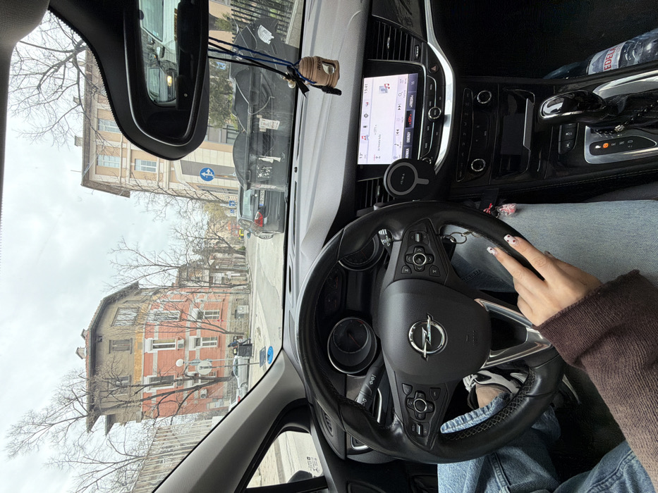 The image provides a forensic view from inside a left-hand drive vehicle, looking outward onto a city street in Plovdiv, Bulgaria. In the immediate foreground, a black leather-wrapped Opel steering wheel dominates the left side. The lower body of a person, clad in light blue denim jeans and a brown long-sleeved top, is visible. The person's right hand, displaying nails with a white base and black spotted design, rests on the lower right spoke of the steering wheel. Keys with a pink charm dangle from the steering column. The dark-toned dashboard features a central infotainment screen displaying a media player interface. A "PRIMA" branded magnetic phone mount is attached to the dashboard to the left of the screen. An automatic gear shifter is visible to the lower right, accompanied by a clear plastic bottle of EDELIA water. A wooden, beehive-shaped air freshener hangs from the rearview mirror, which reflects a white vehicle. Beyond the windshield, a paved street extends under an overcast sky. On the left, a multi-story building with red/orange and beige sections, featuring multiple windows and exterior air conditioning units, stands at a street corner, partially framed by trees with bare branches. A white car is parked on the street adjacent to this building, and a lone individual in dark attire is discernible on the sidewalk nearby. On the right side of the street, a dark-colored BMW sedan (license plate PB 7786 AB) is parked, positioned next to two large black industrial trash bins. Another lighter-colored building is visible further down the street on the right. Blue circular road signs are present on both sides of the thoroughfare.