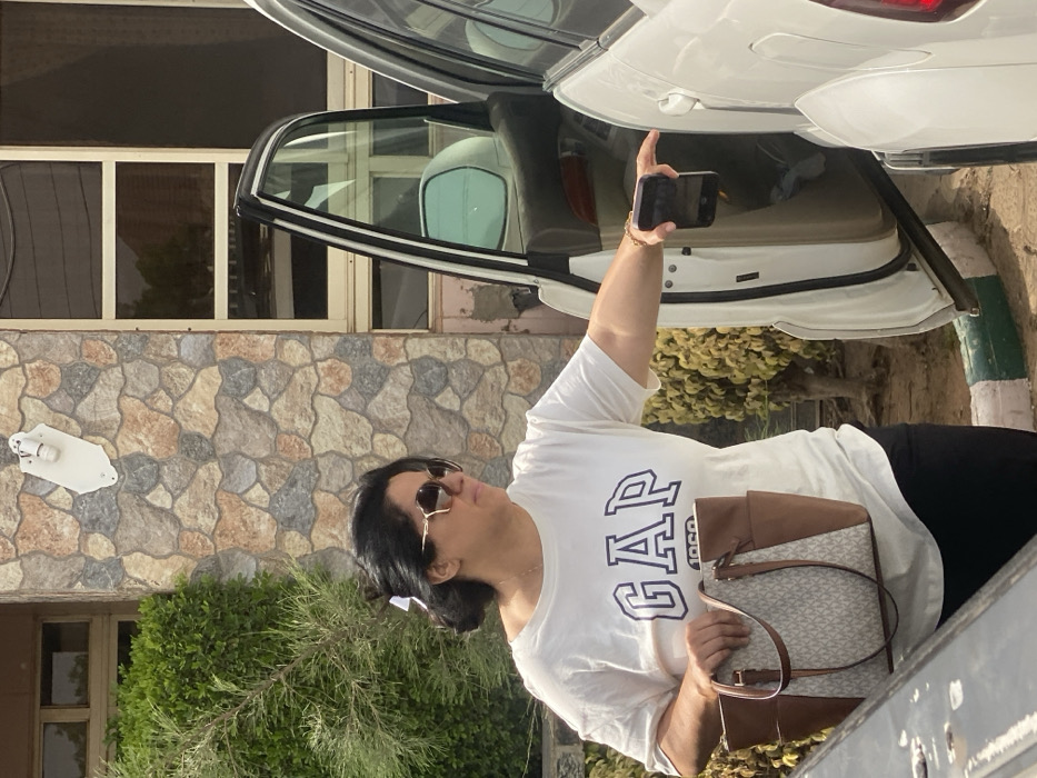 A woman in sunglasses and a GAP t-shirt stands with a brown and white handbag, holding a phone up to the open trunk of a white car