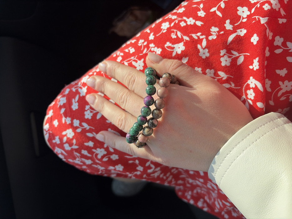 A close-up image shows a person's right hand resting on their leg in Dub, Montenegro. The hand displays two beaded bracelets: the upper one consists of spherical green and reddish-purple beads, while the lower one features spherical, mottled brown and pinkish-beige beads. The leg is covered by red fabric patterned with small white flowers. The cuff of a light-colored (off-white or cream) jacket with visible stitching is partially visible on the lower left. Strong illumination from the upper left casts distinct shadows. The background is dark and out of focus, consistent with an interior setting, likely a vehicle.