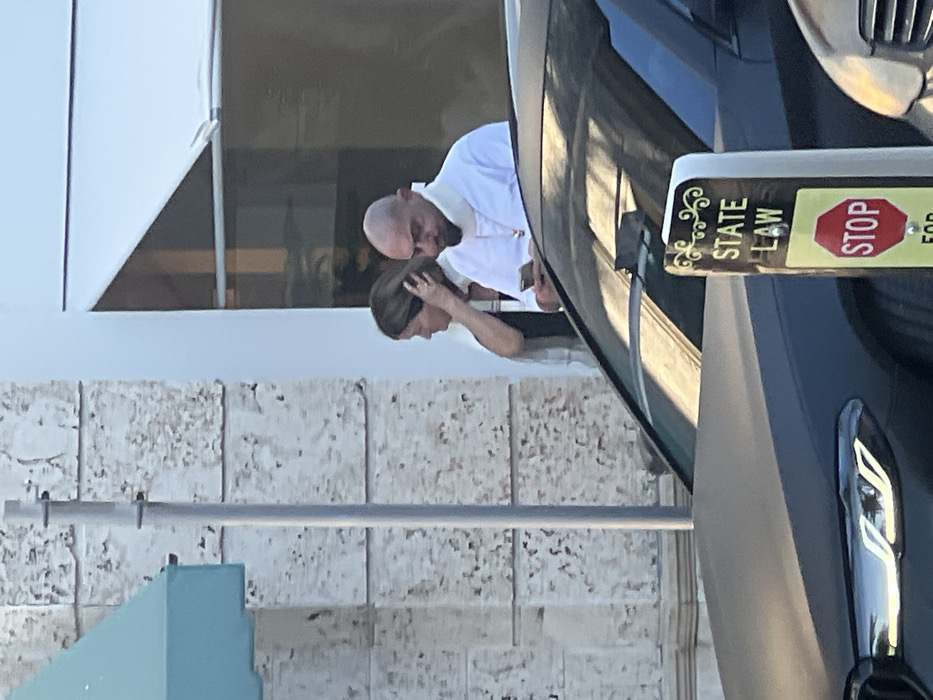 A man and a woman stand near a black car with a "State Law - Stop for" sign on the door frame. The man is bald and wears a white shirt. The woman has dark hair and her hand is near her head. They are partially obstructed by the car. In the background, there is a light-colored building with a geometric window design and a textured wall.