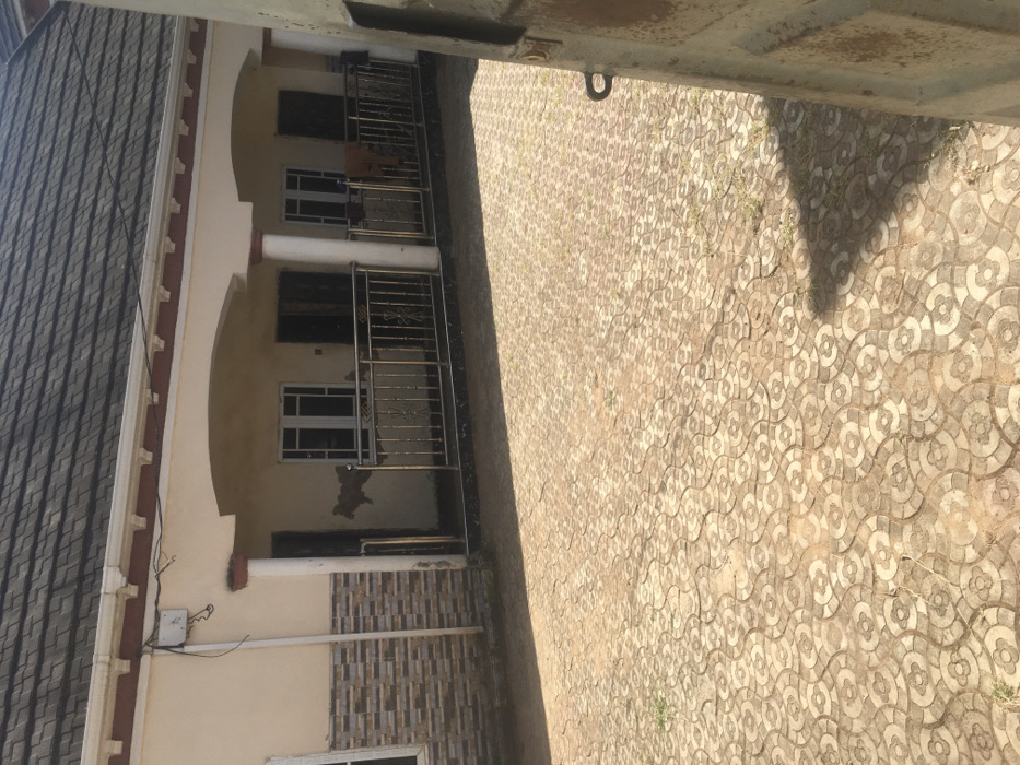 The image displays a single-story building facade located in Jos, Nigeria. The structure features a dark-colored tiled roof with white gutters and a reddish-brown trim beneath the eaves. The main wall is painted a faded cream color, with noticeable areas of paint peeling and plaster damage, particularly on the left side of the central support column. The lower left section of the facade is clad with horizontally stacked, light-brown and beige rectangular tiles. A raised veranda or porch extends across the front of the building, supported by two rounded, cream-colored columns. A polished stainless steel or chrome-colored railing with decorative scrollwork spans the length of the veranda. Behind the railing are multiple white-framed windows and dark-colored doorways. On the far right section of the veranda, a folded brown or rust-colored fabric object is draped over the railing. On the upper left of the facade, a white utility box is mounted, with exposed black electrical wiring running from it and along the wall. The ground area in front of the building is paved with interlocking light-beige pavers featuring a repeating circular or floral pattern. Patches of dirt and sparse green vegetation are visible between the pavers. Strong sunlight illuminates the scene, casting shadows, including a prominent shadow from the building's overhang and a partial shadow from a vertical, rust-colored structure or gate post visible on the far right edge of the frame. No individuals are present, and no active interactions are depicted.