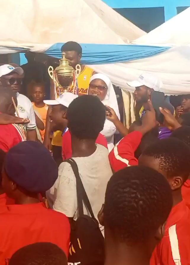 A celebratory scene unfolds under a white tent, likely an event or gathering. A man stands holding a golden trophy aloft, surrounded by a crowd of people. A woman in a white hijab speaks into a microphone, possibly addressing the crowd. The crowd includes people wearing red uniforms. They appear excited, clapping and gesturing. Some are taking photos with their phones. The background includes a building painted blue and other structures, suggesting an outdoor setting.