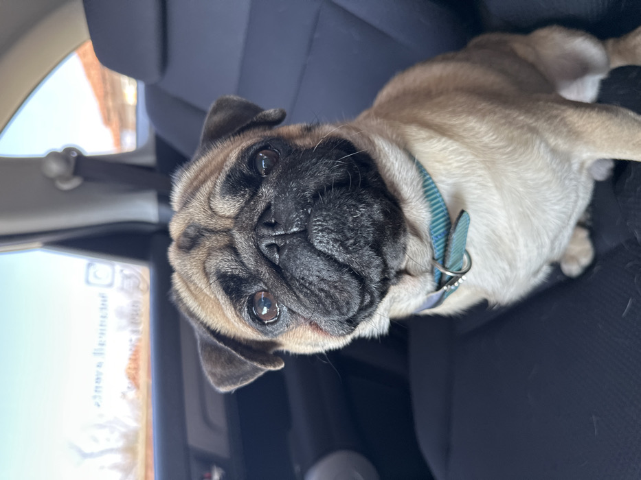 - "A fawn-colored pug dog is seated upright on a dark gray fabric car seat within a vehicle" by FM-pkfgx1, licensed under CC BY 4.0