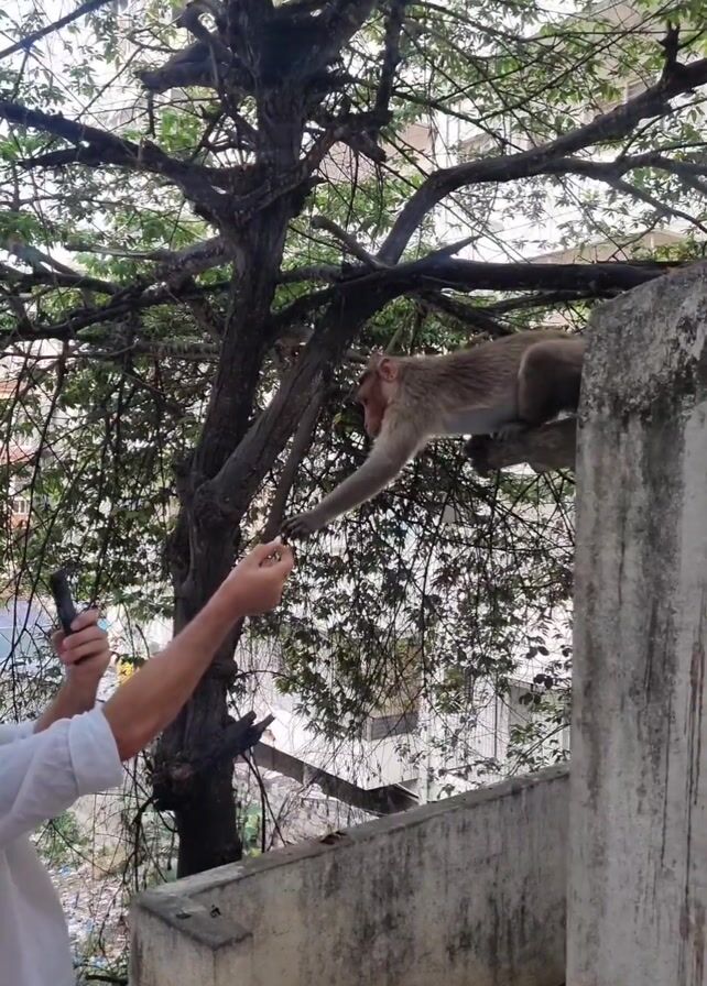 A man is feeding a monkey. The man, dressed in a white shirt, stands on the ground and offers something from his hand to the monkey, which sits on a ledge connected to a tree. The monkey, light brown with a darker face, reaches down and takes the offering, then sits up to eat it. The background consists of a tree with dense foliage, a concrete wall, and buildings in the distance. The day appears overcast, with diffuse natural light.