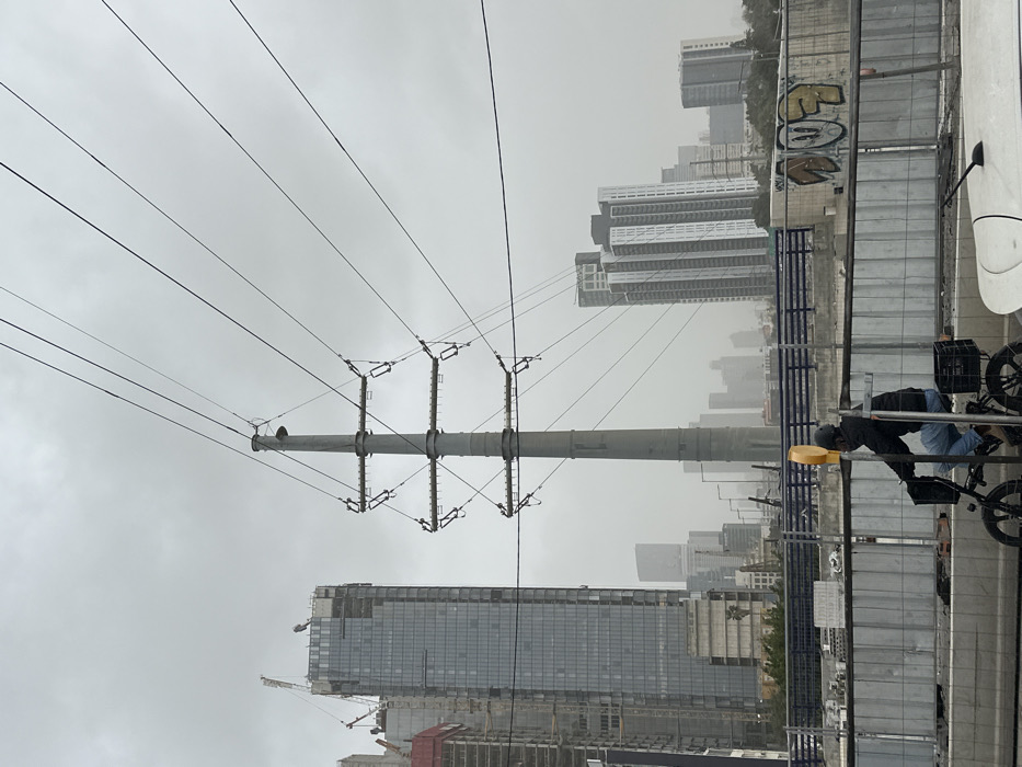 This image depicts a hazy, overcast daytime scene in Tel-Aviv, Israel, characteristic of an urban area undergoing significant development, likely near a major transportation corridor such as the Ayalon Highway. In the foreground, a male individual, wearing a dark jacket, light jeans, a dark helmet, and a dark face covering, rides a black electric bicycle. The bicycle features thick tires, a front basket, and a black crate on the rear rack. A yellow circular marker on a pole is positioned to the rider's left. To the immediate right, the white roof and antenna of a stationary vehicle are partially visible. Behind the cyclist, a grey concrete barrier runs horizontally, followed by temporary white and grey construction barriers, some of which display graffiti, including a stylized cartoon face and text. The midground is dominated by a tall, grey, lattice-style power transmission tower standing centrally, supporting multiple high-voltage power lines that extend diagonally across the upper frame against the light grey sky. Behind the barriers, an elevated blue-grey structure, possibly a bridge or overpass, spans horizontally. In the background, a dense urban skyline is visible through atmospheric haze. On the left, a tall, modern skyscraper with a glass facade is under active construction, with cranes and scaffolding visible near its summit. Adjacent to it, other multi-story buildings are also under construction. To the right of the transmission tower, several other completed high-rise buildings, some featuring prominent vertical architectural elements, rise into the overcast sky, with more distant structures fading into the general atmospheric haze.