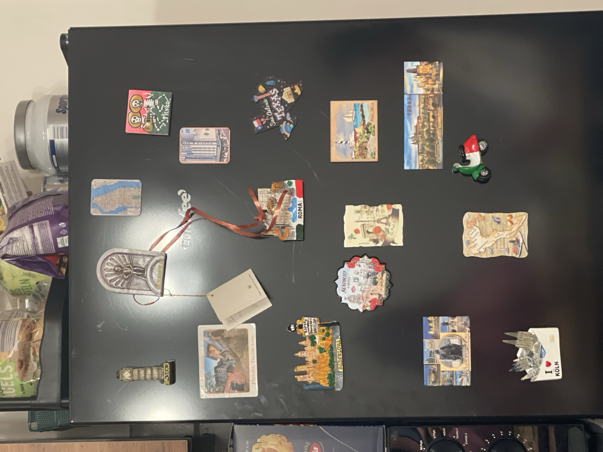 A black refrigerator door is depicted vertically, laden with numerous souvenir magnets and other small objects. Resting on top of the refrigerator, from left to right, are a clear plastic container, a green and yellow plastic bag, a purple plastic bag, and a white plastic jar with a grey lid, partially labeled "Sport." On the refrigerator door, starting from the top left: * A gold-colored magnet of Big Ben (London). * A grey magnet of Manneken Pis from Brussels, with red ribbons attached. * A rectangular magnet with a blue and white abstract map pattern. * A rectangular magnet depicting two colorful skeletons playing music, labeled "Mexico." * A rectangular magnet showing a building facade, possibly a church or cathedral. Below the top row: * A rectangular magnet displaying a street scene, labeled "Plovdiv, The Old Town, Bulgaria." * A plain white paper tag hanging from a string. * A 3D magnet depicting Roman architecture, labeled "ROMA." * A black magnet shaped like the state of Texas, illustrating various landmarks, labeled "San Antonio TEXAS." Mid-section of the door: * A 3D magnet featuring golden architecture, labeled "BARCELONA." * A circular magnet with a cityscape bordered by red flowers, labeled "MADRID ESPAÑA." * A rectangular magnet showing the Eiffel Tower and "PARIS." * A rectangular magnet depicting a lighthouse and sailboats by the sea, labeled "MALLORCA." Lower section of the door: * A rectangular magnet with a collage of scenes and a statue, labeled "Bundestadt Leipzig." * A rectangular magnet showcasing a panoramic view of a city, labeled "PRAHA." * A white envelope-shaped magnet containing miniature gothic spires, labeled "I ❤️ KÖLN." * A 3D magnet of a Vespa scooter in red, white, and green (Italian flag colors). To the left of the refrigerator, a partial view of a black kitchen appliance, likely a microwave or oven, is visible, featuring various control dials and buttons labeled "M.High," "High," "Grill," "Combi 1," and "Combi 2." The scene is an interior view, consistent with a kitchen in Saarbrücken, Germany.