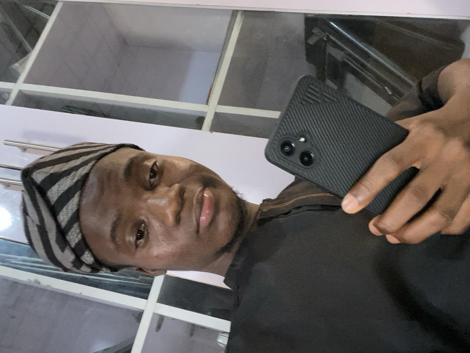 A selfie of a man with dark skin and a black and grey striped cap. He wears a black shirt and holds a dark grey smartphone case with two lenses in his right hand. The background shows an area with white window dividers, reflecting a kitchen's appearance. His gaze is directed slightly downward.