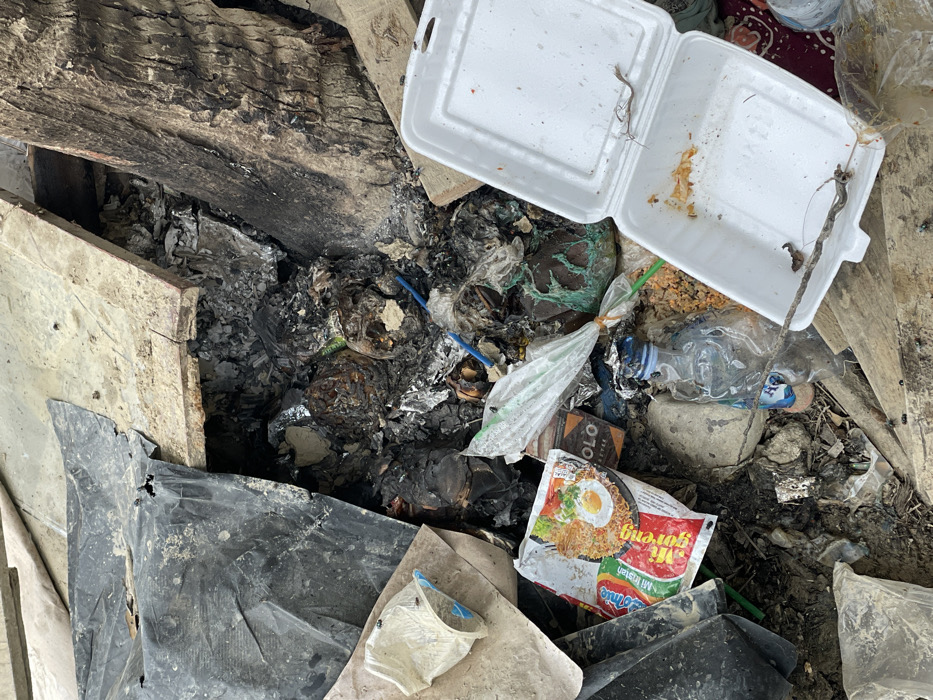 A heap of trash displays varied waste. Burned remnants mix with plastic containers, a discarded water bottle, and food packaging, including a Mie Goreng instant noodles packet. A white styrofoam container, partly open, lies nearby. Black plastic sheets and wooden debris also contribute to the disarray. The scene evokes a sense of neglect and environmental pollution.