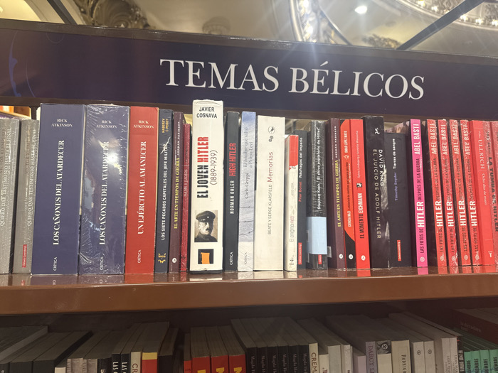 A medium close-up, eye-level photograph depicts a section of a bookstore shelf, displaying numerous books primarily focused on war history, specifically World War II and Adolf Hitler. The scene is set in El Ateneo Grand Splendid, located on Santa Fe Avenue in Buenos Aires, Argentina, evidenced by the distinctive ornate, gilded architecture visible in the upper background. A prominent dark blue sign with white capital lettering, "TEMAS BÉLICOS" (War Topics), labels the shelf. Below this sign, approximately thirty hardcover book spines are arranged on a brown wooden shelf. Dominant colors of the spines are red, dark blue, white, and black. Multiple visible titles include "LOS CAÑONES DEL ATARDECER" (Rick Atkinson), "UN EJÉRCITO AL AMANECER" (Rick Atkinson), "EL JOVEN HITLER (1889-1939)" (Javier Cosnava), "HIGH HITLER" (Norman Ohler), "EL MOMENTO EICHMANN," "EL JUICIO DE ADOLF HITLER" (David King), and "LAS FOTOS DE HITLER" (Abel Basti), among others prominently featuring "Hitler" in their titles. One book spine ("EL JOVEN HITLER") displays a black and white portrait of a young Adolf Hitler. Several books are encased in clear plastic wrapping. Below the primary shelf, an additional shelf filled with books is partially visible. No individuals are present within the frame. Artificial lighting illuminates the books and the background architecture.