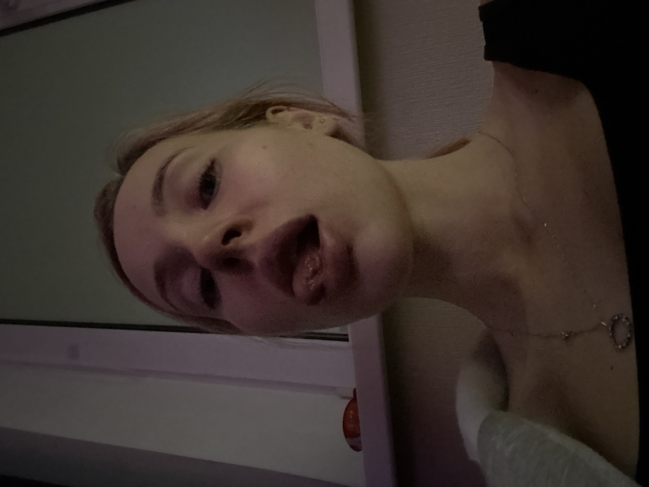 A woman with blonde hair appears in a close-up selfie, tilted sideways. She is fair-skinned, with her mouth open and tongue visible. She wears a black top and a delicate gold necklace with a circular pendant. Part of a white window frame is visible to her left, and the background is blurred. The lighting is dim, casting shadows on her face and neck.