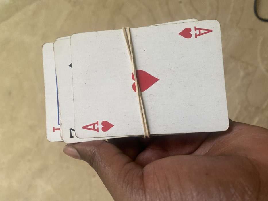 A dark-skinned left hand holds a stack of worn playing cards, secured horizontally by a light-colored rubber band