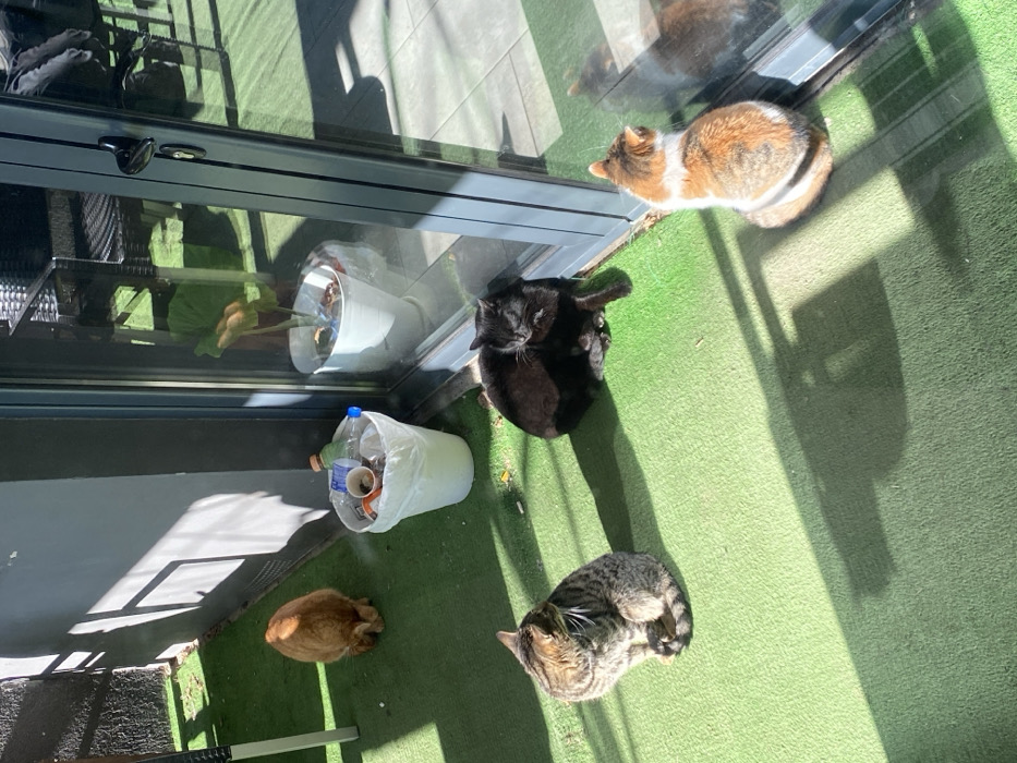 The scene depicts an outdoor patio or balcony area in Palilula Urban Municipality, Serbia, illuminated by direct sunlight. The ground is covered with green artificial turf. Four domestic cats are present. A solid orange cat is positioned in the upper left, facing away from the viewer with its head lowered towards the turf. A brown-grey tabby cat sits upright in the mid-left, oriented towards the right. A solid black cat rests by a large glass door in the mid-right, its eyes appearing closed or squinted. A calico cat sits in the lower right foreground, facing the glass door. A white plastic trash receptacle, containing plastic bottles, paper cups, and other refuse, is situated centrally near the glass door. The glass surface reflects an interior space containing a potted plant in a white pot and dark furniture. Distinct shadows are cast across the turf from structures outside the frame. Small detritus, possibly cigarette butts, is scattered on the turf near the trash can.