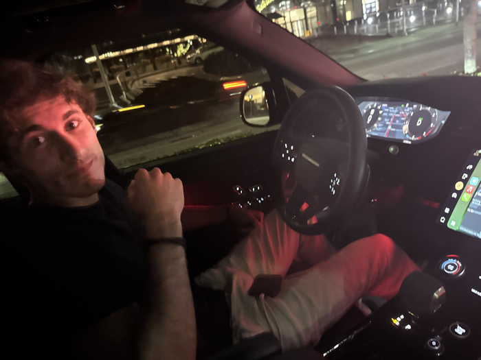 The image displays the interior of an Aston Martin DBX luxury SUV at night, viewed from the front passenger side looking towards the driver and the street. A male individual, appearing to be in his twenties or early thirties, occupies the driver's seat. He has curly brown hair and wears a dark-colored shirt. His face, partially illuminated by red interior ambient lighting, is turned towards the camera with a slight, relaxed expression. His right hand is partially clenched near his chest, and a dark bracelet is visible on his right wrist. His legs are extended, wearing light-colored pants, with a smartphone resting on his left thigh. The car's interior features include a modern, multi-function steering wheel, an active digital instrument cluster displaying vehicle data, and a large, vertically oriented infotainment screen on the center console showing a map-like interface with application icons. Various illuminated controls are visible throughout the dashboard and center console. Through the windshield, a paved street and several illuminated commercial buildings are visible under dark night skies, consistent with an urban environment. A red light streak, suggestive of vehicle taillights, and a fainter yellow light streak appear in the background, indicating movement or traffic. The scene's architecture and upscale context place it in an urban area of Miami, United States, likely within an affluent commercial and residential district such as Brickell or South Beach.