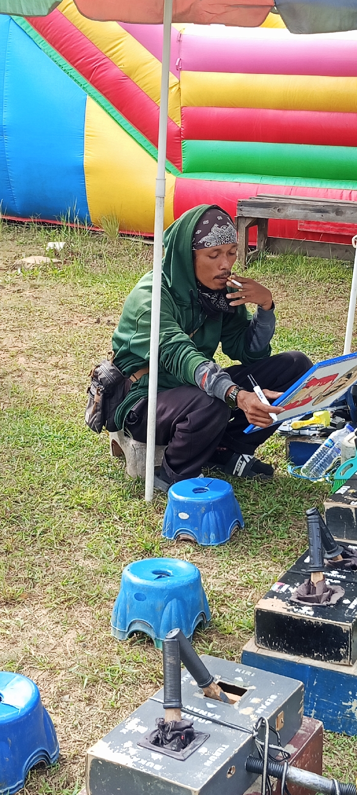 An adult male is observed outdoors in Bandasari, Indonesia, seated on a wooden stool or tree stump. He wears a dark green hooded sweatshirt, a black bandana with a white paisley pattern, dark pants, and black slides. A dark hip bag is slung over his right side, and a watch is on his left wrist. He holds a lit cigarette in his right hand, positioned near his mouth, while his left hand grasps a white marker or pen. He is engaged with a blue-framed board or canvas, which depicts a stylized figure. Behind him, a large, multi-colored inflatable structure (blue, yellow, red, pink, green) is visible. A white pole from an overhead shade structure bisects the frame. On the ground to his right are three blue plastic stools and several dark-colored wooden boxes, some stacked. One box displays Indonesian text, including "KANAN" (right) and "KIRI" (left), and features a joystick-like wooden handle wrapped in black material. A plastic water bottle and a yellow plastic item are also present on the boxes. The ground consists of sparse grass and exposed soil.