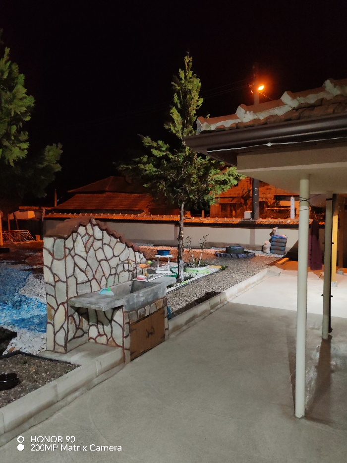 The image depicts an illuminated residential outdoor area at night in Rosen, Bulgaria. In the foreground right, a concrete patio extends, supported by two white cylindrical pillars. Above, a section of a building's roof with brown terracotta tiles and a dark gutter is visible. To the left of the patio, a stone-clad outdoor sink structure is present, featuring a concrete basin that contains a light blue plastic bowl and a green sponge. A wooden cabinet door is integrated into the lower section of this structure. To the immediate left of the sink, an area is covered with blue-colored gravel. Central to the mid-ground, a slender evergreen tree with green foliage is planted within a dark gravel bed, bordered by a low concrete curb. A smaller, lighter-colored gravel area with sparse vegetation surrounds the tree's base. In the mid-ground right, a stack of several bags, possibly containing construction or garden materials, is situated against a light-colored wall. A dark-colored tire is repurposed as a border or planter in the gravel area to the right of the central tree. A red garment hangs on the rightmost white support pillar. In the background, a series of structures with reddish-brown tiled roofs and light-colored walls are visible under a dark night sky. A utility pole with a single glowing orange street lamp is visible in the far background right, providing additional illumination. No individuals are present in the scene.